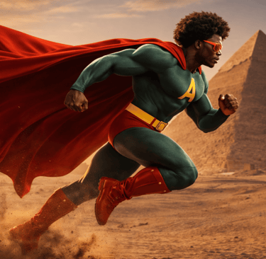 Separated from his father, Kofi stumbled into a hidden chamber glowing with ancient light. There he discovered The Book of Knowledge, guarded by Ausar, God of the Perfect Black. Seeing the purity in Kofi’s heart, Ausar bestowed upon him the book’s power. When Kofi shouted the sacred word, he transformed his hair rose into a mighty afro, his body pulsed with cosmic energy, and his spirit burned with purpose. Afro-Man was born gifted with flight, the strength of 700 men, steel-like skin, and speed beyond measure, all powered by the binary solar system itself.