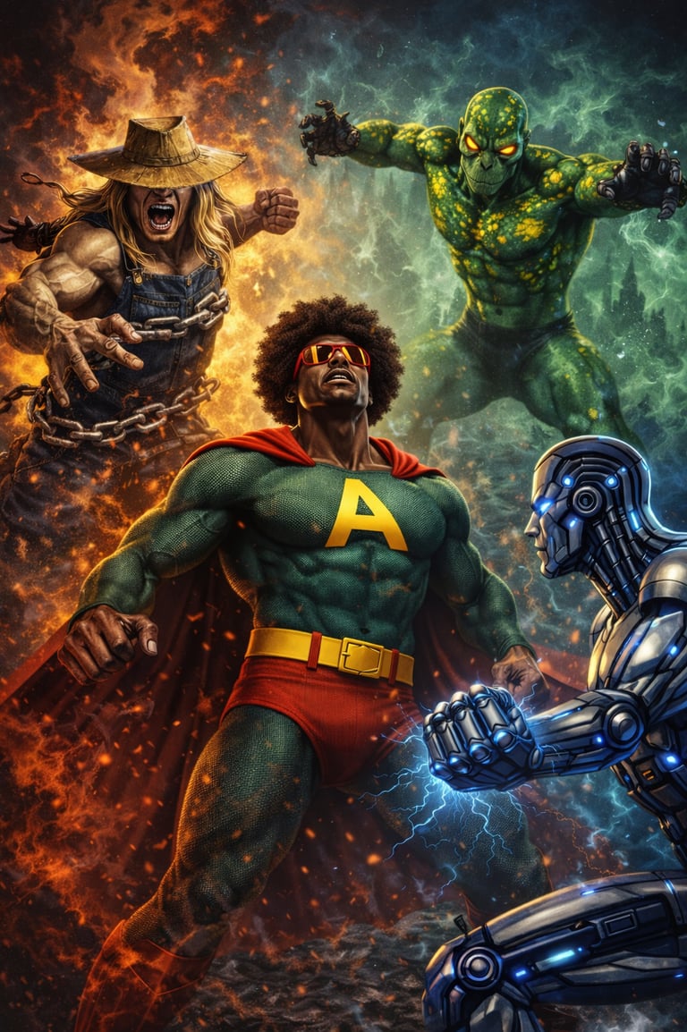 At first, Kofi struggled to balance life as a teen and a hero. After a few daring rescues, the media dubbed him Afro-Man, a name he proudly embraced. Determined not to fight alone, he shared the book’s magic with his friends Jeanette (AUSET), Marty (POWER-KID), and Steve (WONDER BROTHER), forming Afro-Man and The Protectors heroes united to defend truth, culture, and humanity.